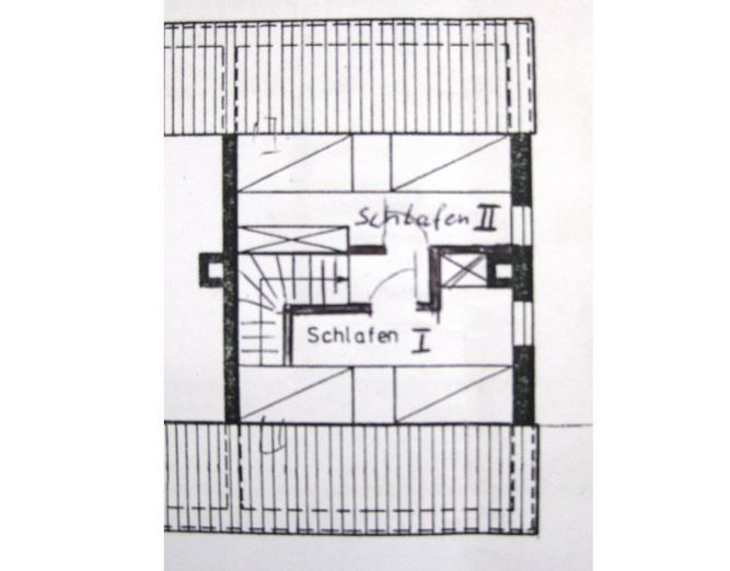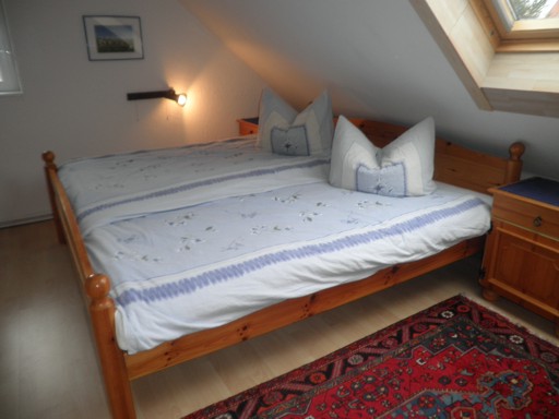 In der oberen Etage liegen die beiden Schlafzimmer, eines mit Doppelbett, das andere mit zwei Einzelbetten und Kinderbett.